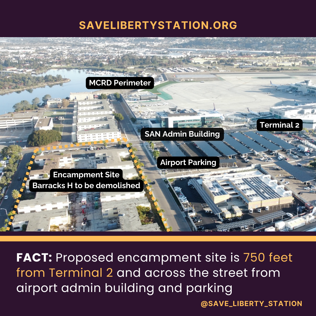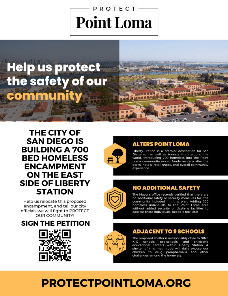 While we support our community members struggling with housing, Liberty Station is the wrong location for a very large homeless encampment. Help us relocate this proposed encampment away from schools, parks, playgrounds, residents, businesses, and the airport!